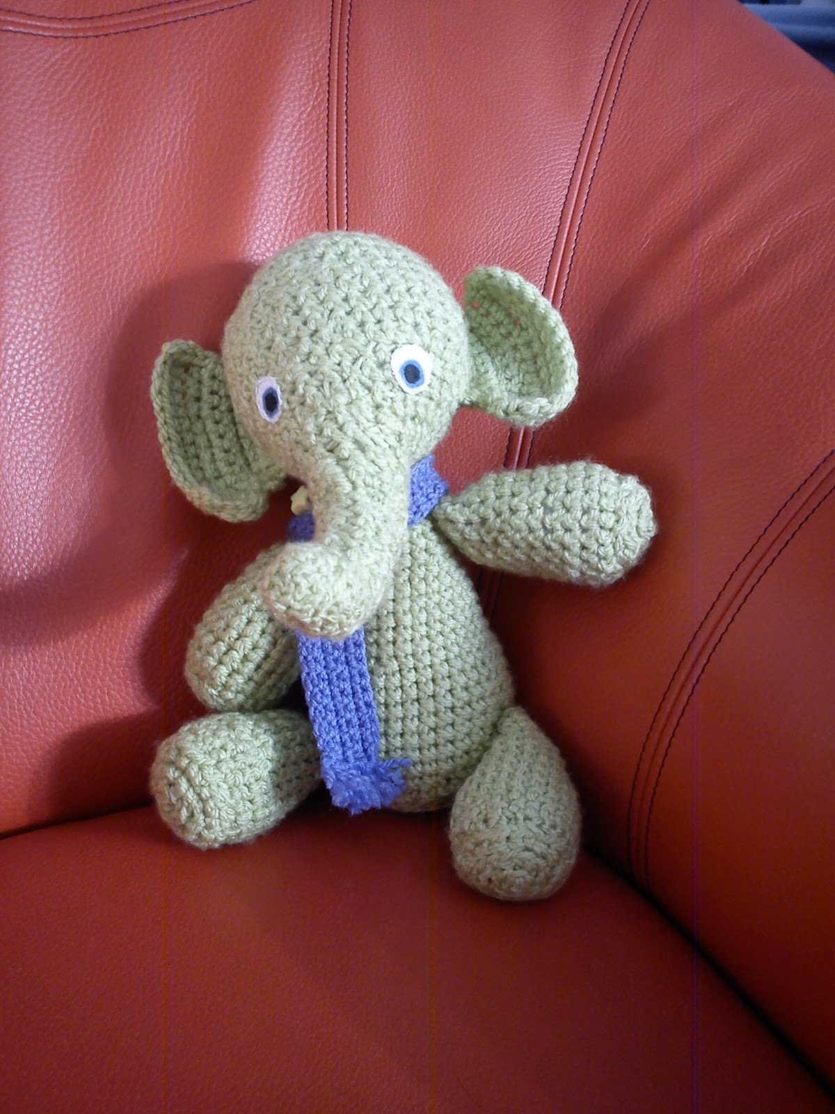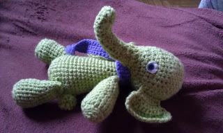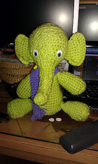 Szósty grudnia w tym roku zaczął się dla mnie, o wiele wcześniej, bo już w listopadzie. To własnie wtedy sporo osób złożyło u mnie prezentowe zamówienia. Jedną z nich była Miss_Kerly, która poprosiła mnie o stworzenie...słonia! Ale tym razem nie zakładkowego, a maskotkowego. Miał być on podarunkiem dla  malucha o imieniu Bartek. Po zatwierdzeniu przez nią mojego projektu i dogadaniu szczegółów zabrałam się do pracy. Po raz pierwszy szydełkowałam tak dużą maskotkę. Słoń mierzył ponad 30 centymetrów i koniecznie musiał być zielony :)